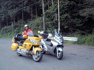 | 10月13日AM5:30 箱根ヶ崎のセブンイレブン やっぱり誰も来ません(悲) そんなら一人でカットビツーリングだ〜! 青梅街道でガソリンを補給して青梅市内から成木街道で爆走です。 時間も早いせいか車もバイクもほとんど見かけません。 しばらく行くと前方に金翼発見。 楽しそうだからしばらく着いていこっと! この金翼はそこらのおっさん金翼と違って結構なペースで走っています。 「へ〜!金翼も乗る人が乗ると結構早いじゃん。」 信号で止まると金翼人が振り返り「秩父ってこっちから行けますか?」 私は名栗経由で秩父に行きますから一緒に行きましょう! お〜〜〜、金翼と銀翼のランデブーだ〜! 正丸トンネル手前で一時止まりちょこっと歓談。