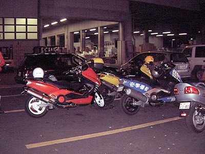 しばらくすると「ヤスさん」「Dolphinさん」到着です。 なにやら怪しいスクーター軍団が食堂前を占拠しています。