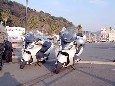 | 今日は17日納車になったカシノキさんの空波の慣らしにお付き合いする事になった。 行き先は伊豆半島。 なぜならこの時期路面凍結であまり走れる所が無いからである。 集合予定は5:00カシノキさん宅、6:30西湘PAだけである。 はたして6:30西湘PAに誰が来てくれるのか? 5:00ジャストにカシノキさん宅到着。 自宅から5分とかかりません。 こんな近くにバイク友達がいるってすごく嬉しい(^^♪ カシノキさん宅前ではすでにカシノキさんが新車の空波(白色)を出してスタンバッていました。 バイクを降りる事も無くそのまま出発。 いつもの通勤路で厚木に行きます。 先週暴走半島からの帰り道暴走半島のさきっぽで給油してそのままでした。 走行距離にして140kmは走っていると思いますが燃料計は1ドットしか減っていません。 燃費が良いのではなく燃料計がいい加減なのです。 厚木で給油するとやっぱり9L入りました。 まあ、そんなもんでしょう、SUZUKIさんだし。 そんなんでR129で平塚に出て海岸線のR134を先週とは反対方向の小田原に向かいます。 西湘BPは交通量も少なく快適です。 6:30ジャスト西湘PA到着 すでにまなさん・たけちゃんが到着してお茶してました。 たけちゃんはママが風邪をひいてしまったのでここでお別れです。