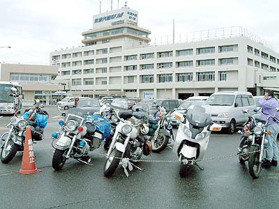 | バイクは一番先に乗船できるので列の先頭で 待機しています。 ハレー軍団は大宮から下道できたそうです。 タンデムもいました。 若いって素晴らしい。 |