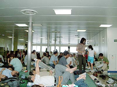 | あっ!と言うまにこんな状態です。 難民船状態でタバコも吸えないので 私はずっと甲板にいました。 2時間20分の船旅だから我慢できますが 3時間以上だったら特等とって行くでしょうね。 (いくらか知りませんけどね(笑)) | |
