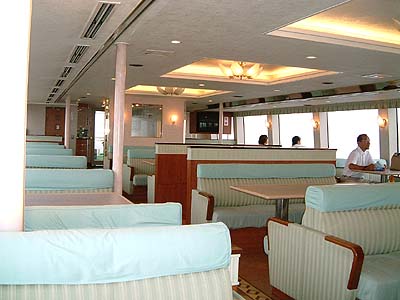 | 遊覧船は1400円なのですがお金持ちの 「おやじん」はさらに600円も出してグリーン席に 行きました。 下の一般席は満員でしたがこの2階席は がらがらでした。 この600円は安かった。 | |