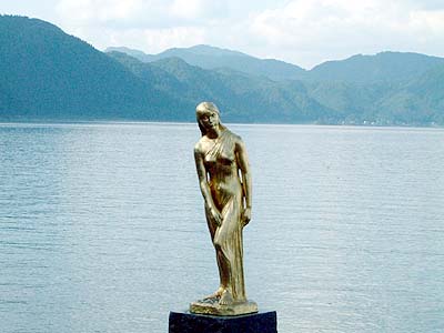 | 鹿角の町を抜けると直ぐに田沢湖に到着です。 田沢湖を左回りの予定ですがまなさんがちょっと 行くと「たつこの像」があると言うので行ってみると 金色の像が湖の中に建っていました。 ちょっぴりエロイこのたつこさんって誰? よー知らん! | |