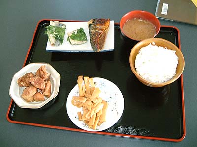 | 晩飯です。 ご飯3杯食べました。 工藤さんが差し入れてくれた イカのお刺身がとっても美味しかった。 | |