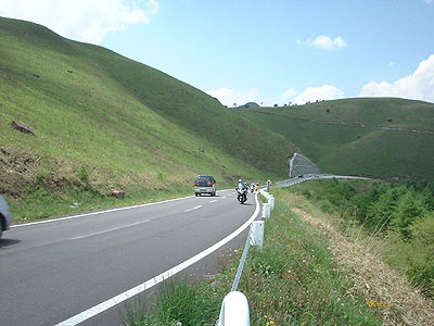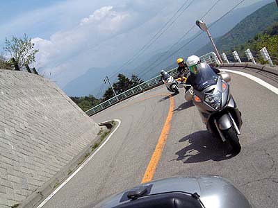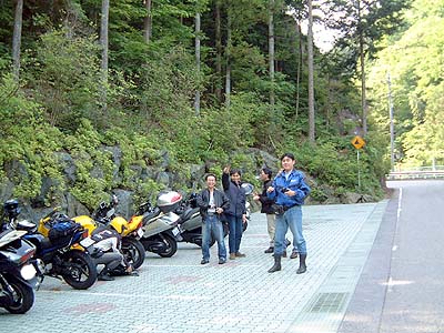 名栗渓谷を抜けて正丸トンネルの先に出ます。 なかなかさんは、やっぱり正丸峠を走りたかったらしい。 「イニシャルD」の舞台だもんね。 R299に合流した後は秩父市内を抜けます。 夕方は大変混みますがこの時間帯なら大丈夫です。 途中のセブンイレブンで軽い朝食をとる人と飲み物だけを 買う人がいました。 秩父市内を抜けるとそこは快適、快走です。 途中、恐竜の足跡で休憩です その後は、またまた気持ちの良いワインディングです。 気持ちよくぶどう峠との分岐点までやってまいりました。 このまま、R299は走れません。 なぜなら、途中で通行止めとなるんです。 その脇を抜けるわき道を走ります。 しかし、この道は砂が浮きまくっている道です。 そんなことはお構いなくガンガン進みます。 頂上付近で再度R299に合流します。 左に行くと十石峠の頂上ですが、右には「通行止め」の看板が・・・・・・・ ダーさんは、とっても気になっているみたいでした。 きっと、団体のツーリングじゃなかったら見に行ってしまうんでしょうね(笑) そこからチョットで十石峠の頂上に着きました。 だ〜れもいない駐車場に9台のバイクが揃います。 なかなか良い感じですね。
