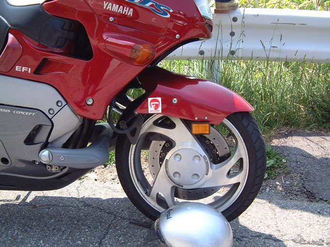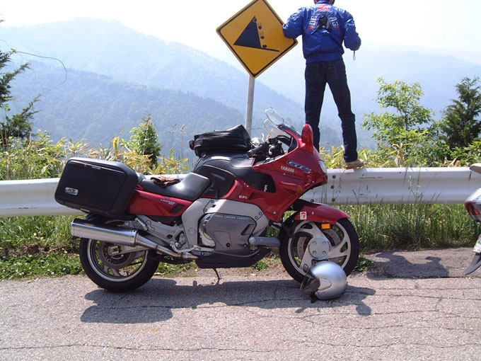 | 4人でだべっていると、そこに赤いYAMAHAのマシン登場1000GTSです。 |