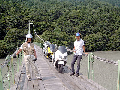 R362から県道388へ、向かうは長島ダムから接阻峡温泉経由で井川ダムです。 1車線のワインディングが延々と続きます。 けして良いとはいえない路を3台は突き進みます。 twocimaさんのリクエストで秘密のつり橋にも連れてってもらいました。