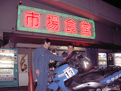 | 12月06日金曜日 17:00帰宅。 今日は横浜でtwocimaさんとお食事会です。 行き先は「市場食堂」 安い・うまい・大盛り もちろん情報源はダーさんです。(ダーさんありがとう) 先日営業中に「うに丼」食べたら美味しかった。 今日は「ハンバーグ定食」大盛りに挑戦です。 大盛りご飯は650g。 19:00ジャスト自宅出発。 仕事で鴨居には良く行くので慣れた道をマッタリ走ります。 中山通過19:37.ちょっと早すぎるぞ〜。 追い越し、追い抜き、すり抜けを全くしないでこの時間です。 でも、こんなに安全運転してるとリズムが狂ってきます。 神奈川駅のガードをくぐり国道15号を右折して中央市場の信号を左に曲がると すぐ市場が左右に見えてきます。 20:10到着。 誰もいないだろうと思いましたが、「かずすけさん」がすでに到着していました。 「かずすけさん」は私と同じ空波乗りの先輩です。 「こんばんは〜〜」しばらくお話していると 「一撃離脱号」が静かに到着です。 お〜〜〜!R1のマフラー付けてる!
