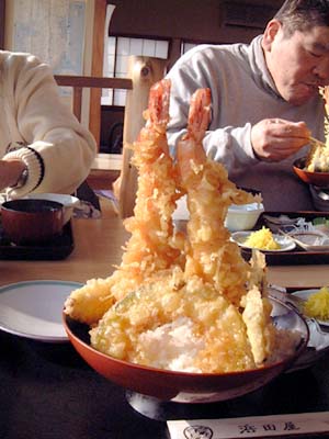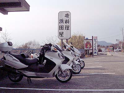 どこか適当なところで食事をしようと言うことでそのまま海岸線を南下します 交通量の少ないR134を3台のスクーターが爆走しています。 あれ???そういえば今日はカシノキさんの慣らしだよな〜。 でも、カシノキさんも空波のコーナーを楽しんでいます。 そこで私のナビに出てきた「浜田屋」さんに到着です。 前から気になっていた「ビックリ天丼」です。