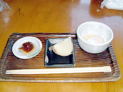 | 私が頼んだのはお蕎麦。 写真は前菜の梅干の漬物とジャガイモと温泉卵です。 お蕎麦は撮り忘れました。 味も量も普通でした。 |