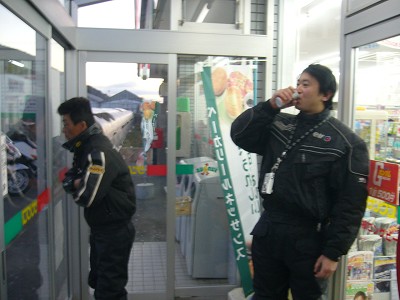 | 足柄付近は気温0℃でした。 浜松ICで虎三さん、RONさんと合流。 3台で伊良湖を目指します。 渥美半島に入ってからはとても寒いです。 ココは途中のコンビニです。 |