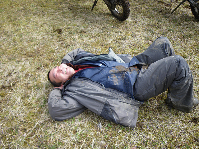あ〜〜あ いってつ君は心が折れて もう自分だけではバイクを 起こせなくなりました(笑) |