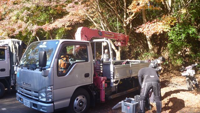 | いきなりD山駐車場 関西組は2t車に4台載せて やって来た。 |